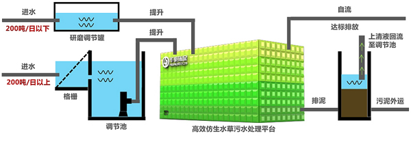高效仿生(shēng)水草(cǎo)汙水處(chù)理平台工藝流程圖