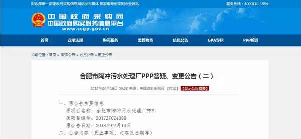 近日,備受關注的合肥市十(shí)五裏河汙水處理廠、合肥市(shì)陶衝汙水處理廠兩大(dà)PPP項目同時發布答疑、變更公告,將開標時間(投標(biāo)截止時間)變(biàn)更為2018年7月10日9:30。距離原定開標時間過去2個月,這兩大汙水廠即將再次展開爭奪戰。