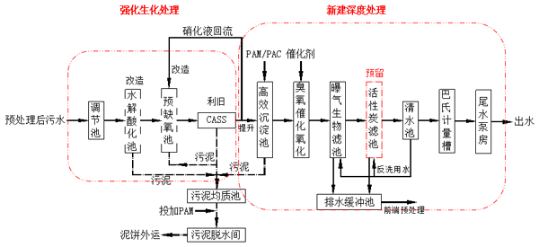 我司於2018年6月與國星(xīng)生化公司簽訂該汙水廠提標改造工程設計采購施工合(hé)同,2019年8月完成水質調試驗收工作。改造後處理工藝采用:水解酸化(改造)+CASS工藝(yì)(改造)+高效(xiào)沉澱池(新建)+臭氧催化(huà)氧化(新建)+曝氣生物濾池工藝(新建),出水為《城鎮汙水處理廠汙染物排放標準》(GB18918-2002)一級A標準,其出水利用現狀汙水管道進入當塗縣第二汙水處理廠(chǎng)。
